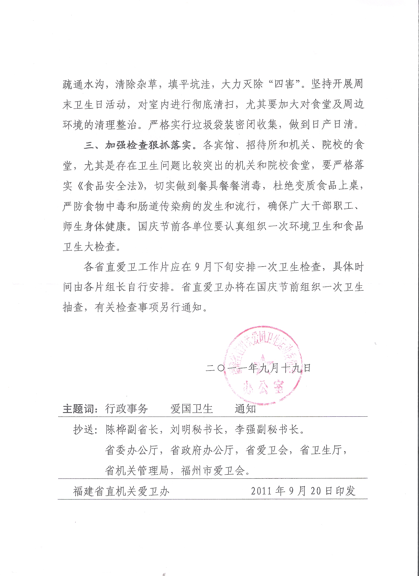 各单位: 现将《福建省直机关爱国卫生运动委员会办公室关于做好国庆爱国卫生工作的通知》(闽直爱卫[2011]15号)转发给你们,请按照通知要求做好国庆爱国卫生工作。宣传部和校医院牵头做好秋季卫生常识的宣传教育工作。相关单位要做好办公楼、办公室、教学楼、实验室、宿舍楼及包干区卫生工作;结合秋季特点做好食堂卫生、食品安全工作;做好校园环境整治和除“四害”等工作。 校文明办和爱卫办将于9月29、30日组织有关部门对全校卫生进行检查,检查结果将作为2011—2012年度校级精神文明建设先进单位评选的依据。