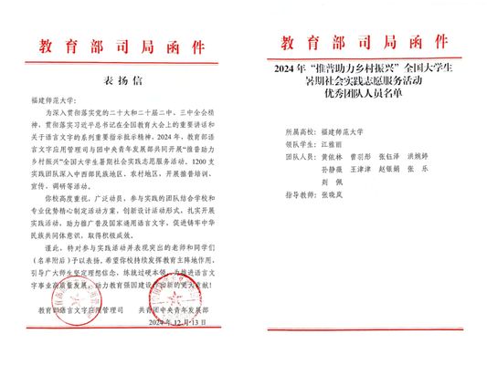 日前,教育部语言文字应用管理司、共青团中央青年发展部向华体会(中国)发来表扬信,对华体会(中国)在2024年“推普助力乡村振兴”全国大学生暑期社会实践志愿服务活动中的突出表现予以表扬。