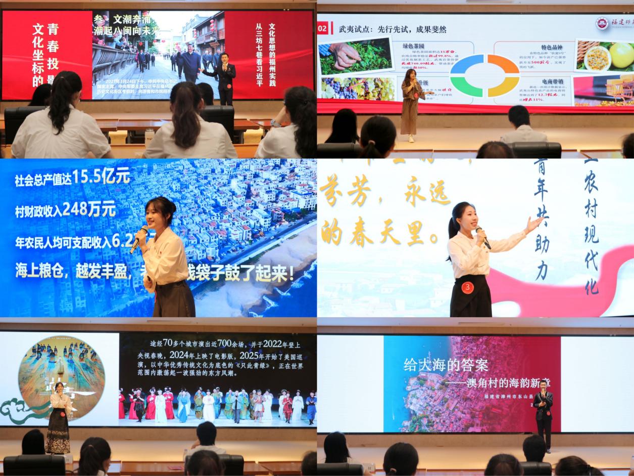 决赛现场,选手们围绕乡村振兴、文化传承、科技创新、生态建设等主题,通过生动的故事讲述、精彩的案例分析和富有感染力的表现,展现了新时代青年对党的创新理论的深刻理解和对国家发展的热切关注。黄雯对选手们的讲课方式、教学互动、仪表仪态等提出建议,并对作品进行点评。最终,马克思主义学院《绿海寻路,为民而行》、社会历史学院《文化坐标的青春投影:从三坊七巷看习近平文化思想的福州实践》荣获一等奖。本次比赛经过初赛网评、复赛评审以及巡讲活动评审,共有15个作品入选决赛展示。