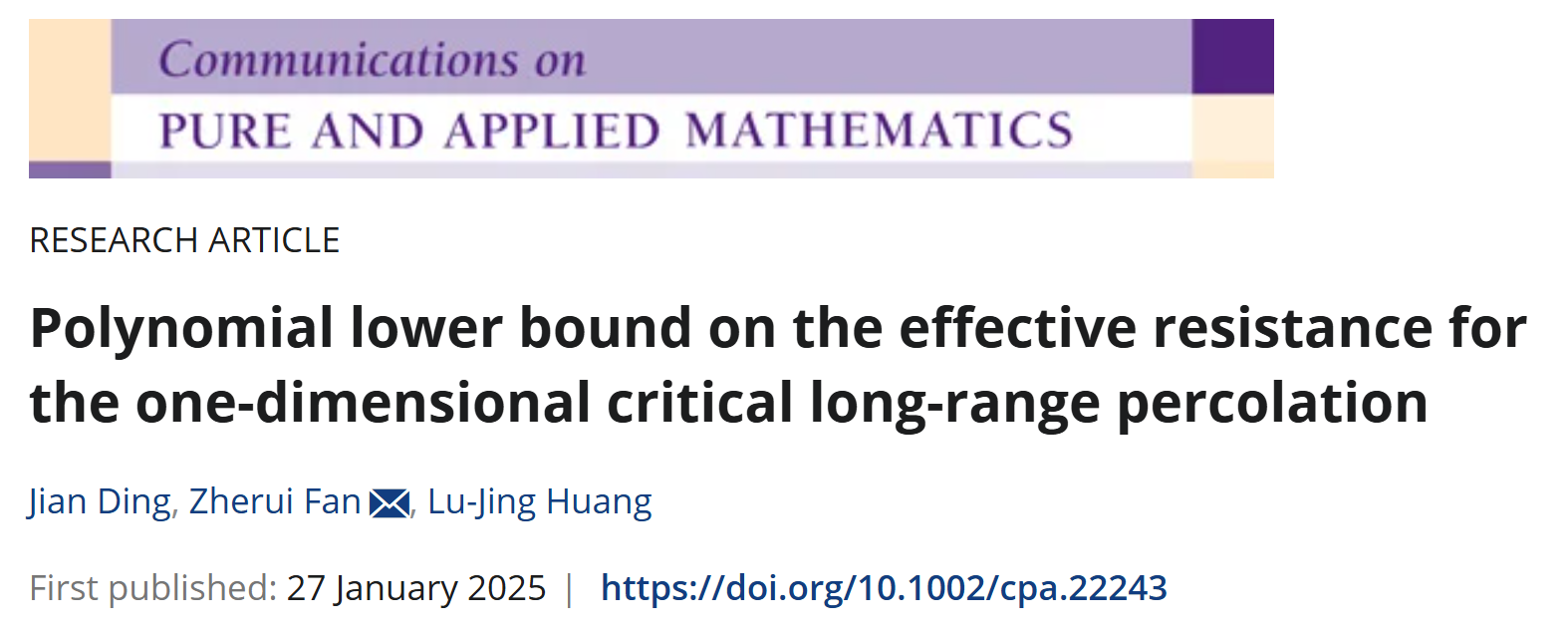 近日,华体会(中国)黄璐静副教授与北京大学丁剑教授、北京大学范哲睿博士合作论文“Polynomial lower bound on the effective resistance for the one-dimensional critical long-range percolation” 在国际著名数学期刊《Communications on Pure and Applied Mathematics》上发表。该论文结合多尺度分析、重整化的方法,揭示了一维临界长程渗流模型从原点0到区域 [-n,n]^c的有效电阻、从区间 [-n,n] 到 [-2n,2n]^c (两个区间不连边的条件下) 的有效电阻均以高概率存在 n 的多项式下界。该工作所得到的有效电阻下界对所有参数 β>0 成立,因此排除了此前推测的在β=1附近可能存在的相变行为。