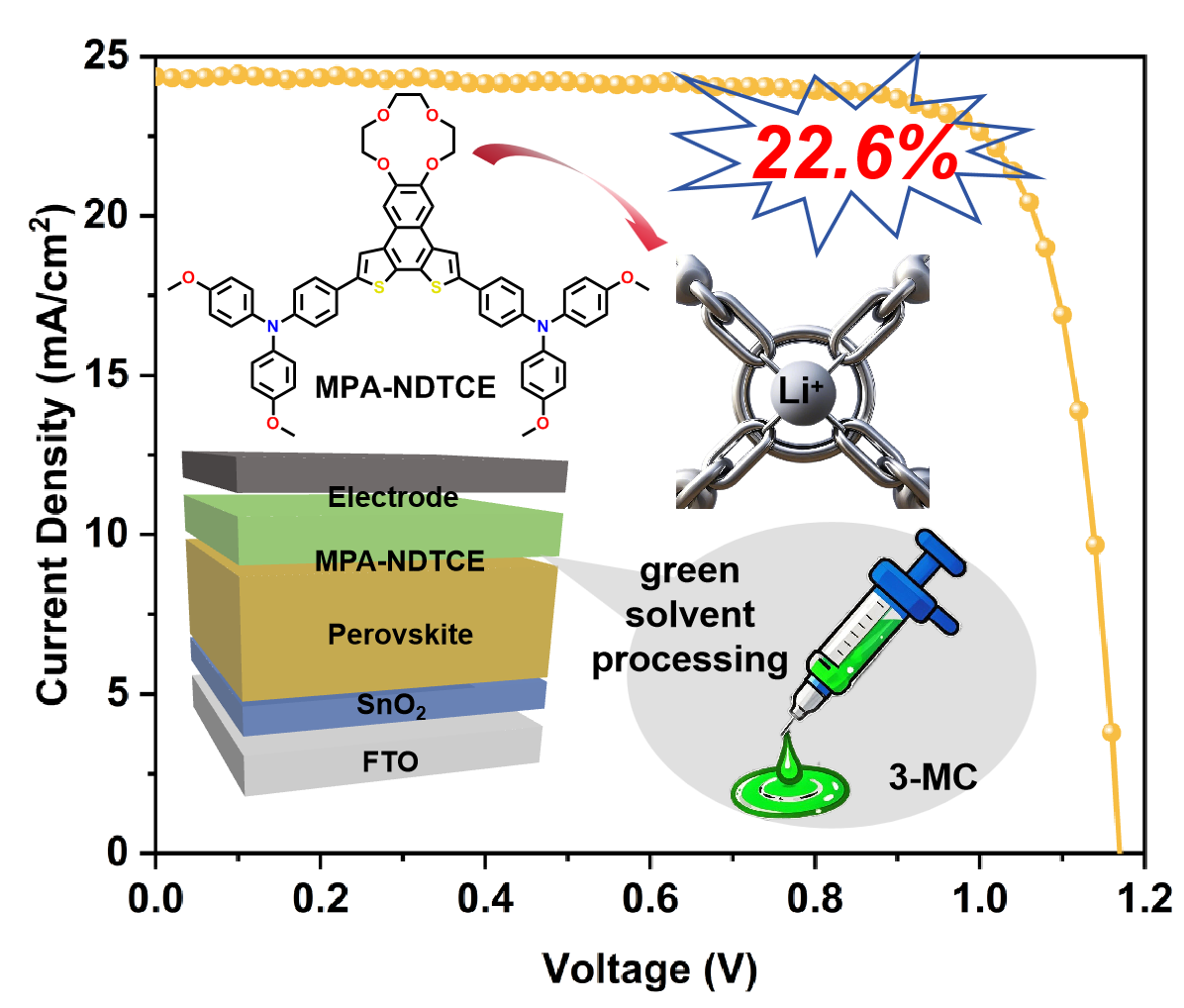 针对上述问题,华体会(中国)海峡柔性电子(未来科技)学院王漾教授、安明伟副教授以及中科院福建物质结构研究所高鹏研究员设计了一种含有冠醚结构的空穴传输材料MPA-NDTCE,通过冠醚与锂离子之间较强的络合作用可以有效抑制锂盐聚集与锂离子的迁移,从而提升空穴传输层的形貌稳定性。值得注意的是,冠醚侧链的高极性赋予MPA-NDTCE在绿色溶剂(如3-甲基环己酮)中优异的溶解性和成膜性,从而避免了传统卤化溶剂(如氯苯)的使用。基于该新型空穴传输材料的钙钛矿太阳能电池最终实现了22.6%的最大能量转换效率,展现了其在高性能与环保加工协同优化方面的潜力。该项工作以“Design of Ionic Lock Structure for tBP-Free and Green-Solvent Processed Hole Transporter in Perovskite Solar Cells”为题发表在期刊ACS Sustainable Chemistry & Engineering上。