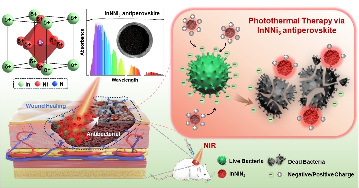 针对这些挑战,我们关注到一类光热应用潜力尚待开发的新型功能材料家族,ANM3型钙钛矿结构的双金属氮化物材料,其中氮阴离子占据中心,被6个X位阳离子包围([Nδ-X6δ+]),与经典钙钛矿的离子排布完全倒置!我们成功合成了镍-铟双金属钙钛矿结构氮化物(InNNi3),并首次将其作为光热转换材料并应用于光热抗菌领域。其在费米能级附近具有准连续的能级分布,赋予了其全光谱光吸收的特性。通过808 nm近红外激光照射,其光热转换效率高达96.91%。此外,其表面的混合价态金属离子(In3+、Ni2+)可增强与细菌的相互作用,使得近红外激光照射协同表面正电荷靶向的InNNi3光热抗菌纳米系统在几分钟内对耐甲氧西林金黄色葡萄球(MRSA)、大肠杆菌(E.coli)和白色念珠菌(C. albicans)均实现超过99.9%的高效、持续灭活。其次,其对耐甲氧西林金黄色葡萄球(MRSA)、大肠杆菌(E. coli)的生物膜也表现出显著的清除效果。在动物模型中,InNNi3通过抗感染、在伤口愈合前期增强CD31表达、刺激胶原蛋白沉积和促进真皮及皮肤附属结构的再生,促进了感染诱导的创面愈合。本研究不仅拓展了InNNi3的光学功能,也为抗菌材料的开发提供了新的方向。