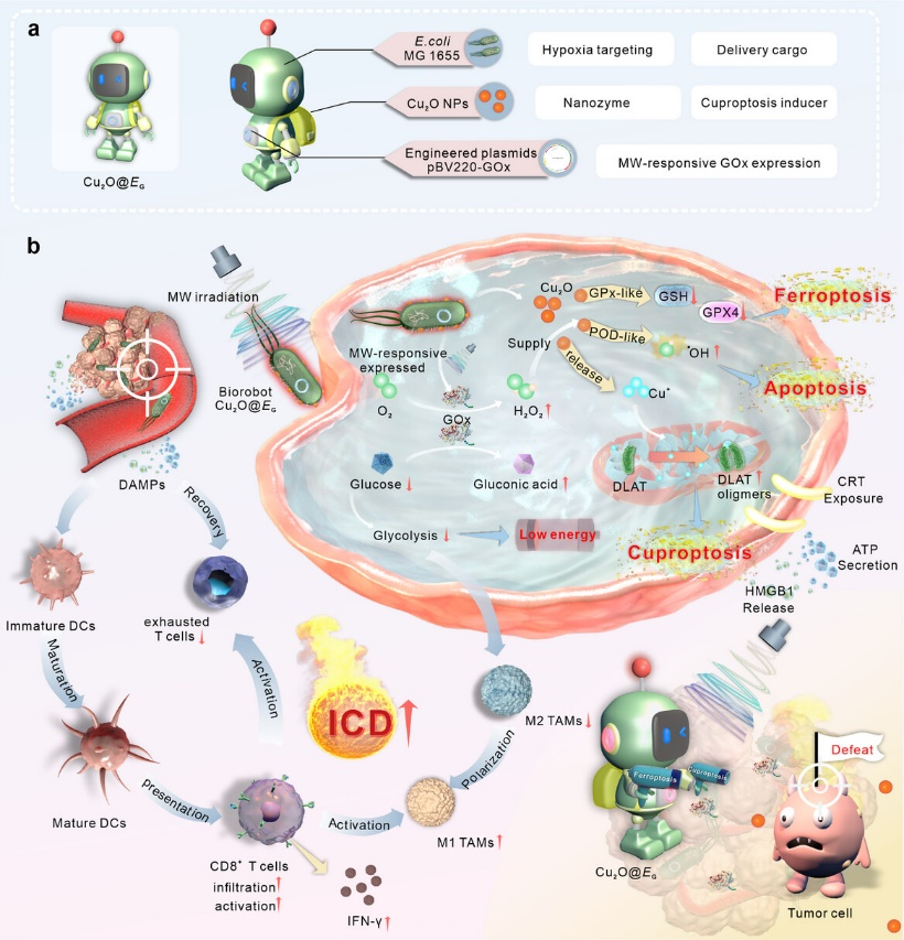 合成生物学的进步为癌症治疗提供了创新策略,但治疗表达和生物安全性的精确控制仍然是关键挑战。为了解决这些问题,生命科学学院曾雪梅副研究员团队基于前期铁死亡创新诊疗策略的基础上(Advanced Science, 2025, 2409967; Nano Letters, 2025, 25, 15, 6013–6023; Chemical Engineering Journal, 2025, 164343),将合成生物学与纳米技术的创新融合,成功开发出微波激活的细菌机器人(Cu2O@EG)。该技术通过工程化改造大肠杆菌(MG1655),使其在肿瘤微环境中可被外部微波精准激活,并表达葡萄糖氧化酶(GOx),快速消耗肿瘤内的葡萄糖并生成过氧化氢(H2O2);同时,细菌表面负载的氧化亚铜(Cu2O)纳米颗粒通过芬顿样反应催化H2O2产生高活性氧(ROS),同步诱导肿瘤细胞发生凋亡、铁死亡和铜死亡三重杀伤,并激活树突细胞和T细胞的免疫应答。动物实验证实,该疗法可高效破坏肿瘤代谢、逆转免疫抑制微环境,且因微波的时空可控性避免了健康组织损伤,为癌症治疗提供了安全、精准的多模态新策略。