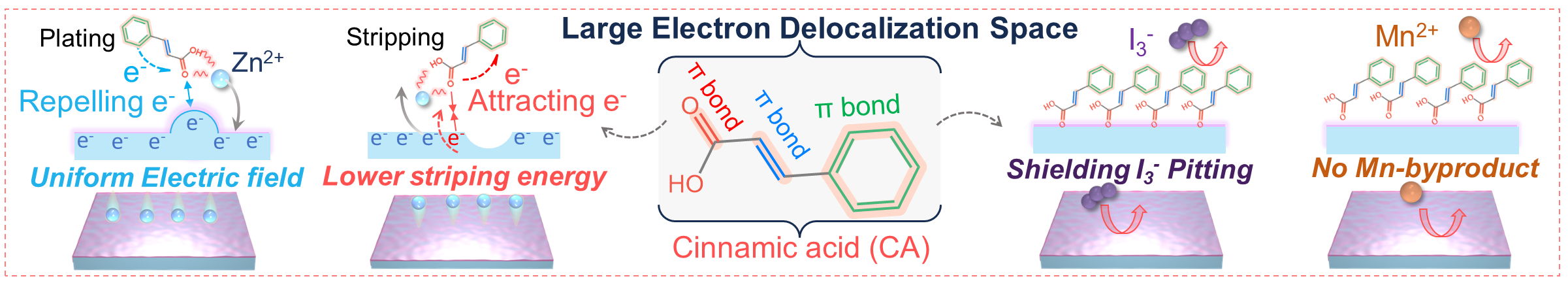 近期,针对Ah级别AZIB实际应用需求为导向,华体会(中国)环境与资源学院陈庆华&钱庆荣&曾令兴教授与南开大学陈军院士团队联合研究,提出了一种动态调节电子和Zn2+离子的策略以实现锌均匀氧化还原,设计了系列具有不同电子离域空间的添加剂分子来验证这种动态调节机制,并总结了普适性的规律。较大的分子内电子离域空间、离域π键和‒COOH官能团的结合,促使肉桂酸(CA)分子在锌负极表面形成了一个稳定的分子层。该层可以有效地防止副反应,并通过驱动电子在共轭原子和官能团之间流动以动态调节负极表面的电子和Zn2+离子的排列,最终在锌氧化还原过程中动态的均匀化电场和Zn2+离子反应位点的分布。得益于这种动态调节,Ah级别的Zn//I2软包电池在2 mA cm-2下表现出1.473 Ah(188.7 Wh kg-1)的高容量和出色的倍率性能。这种动态调节在Ah级别的锌锰软包电池和锌溴电池中具有良好的兼容性。这项工作加深了同行对高可逆性Ah级别AZIB调控机制的理解。该工作成果以“Dynamic Regulation for the Well-distribution of Electrons and Zn2+ Ions Achieving Uniform Zn Redox in Ah-Scale Pouch Cells”为题发表于碳中和领域顶级期刊《Advanced Materials》,该论文第一单位为华体会·官方版网站登录入口,第一作者为华体会(中国)2022级博士生林楚园,通讯作者为曾令兴教授、严振华研究员和陈军院士,陈庆华教授和钱庆荣研究员为本研究工作的主要参与者。