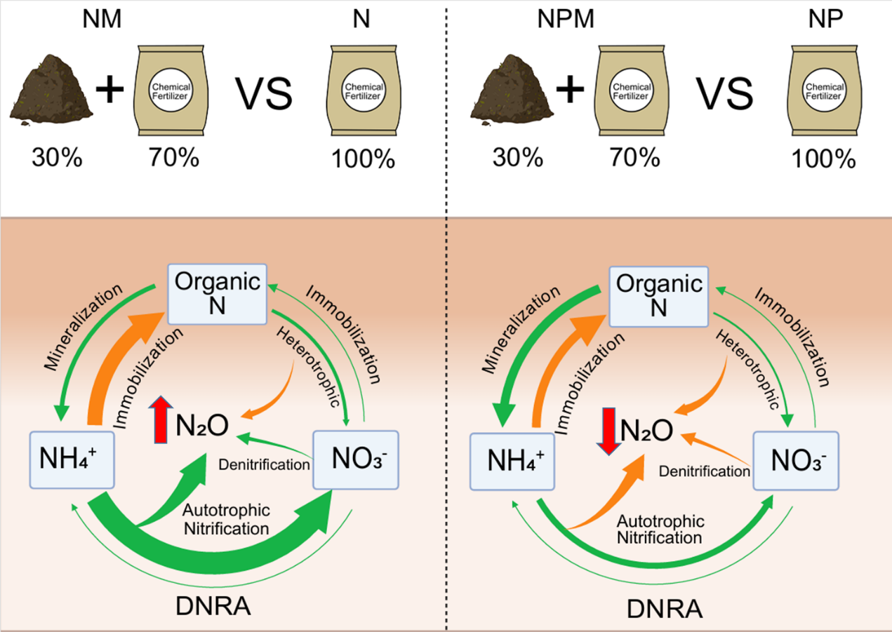 氧化亚氮(N2O)是一种强效温室气体,农业土壤是其最重要的排放源之一。近年来,有机肥部分替代化肥被视为一种可持续的施肥措施,但其对N2O排放的影响存在争议,尤其在亚热带普遍缺磷的酸性土壤中,其作用机制尚不清楚。我院团队依托中国科学院鹰潭红壤生态实验站21年的长期定位试验,利用15N同位素示踪和DNA稳定同位素探针技术,系统研究了粪肥替代在不同养分条件下对N2O排放的影响及微生物机制。研究发现:在单施氮肥的条件下,粪肥替代使N2O排放增加30%;而在氮磷配施条件下,粪肥替代使N2O排放显著降低22%。这种截然相反的结果源于氮转化过程的差异:单施氮肥时,粪肥替代刺激了自养硝化和反硝化作用;而在氮磷配施下,粪肥替代通过降低异养硝化对N2O的贡献,并伴随nosZ II型基因丰度增加,从而减少了N2O排放。