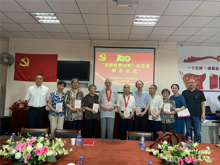 6月29日上午,校医院在仓山校区医院五楼会议室隆重举行“光荣在党50年”纪念章颁发仪式。获颁纪念章老党员卢兴沧、解正理、黄长鼎(家属代表)、潘水金(家属代表),和全体党员参加了仪式。颁发仪式由副书记谢治森主持。