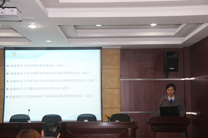 为抓好省委巡视反馈意见整改落实,教育引导教学科研单位和科研人员精准掌握政策,严格执行规章制度。20191231日下午,我处联合财务处在仓山校区邵逸夫楼5楼会议室举办科研项目经费使用专项培训会以及学术道德和学风建设专项培训会。校学术委员会(理工科)、校科研工作委员会、校创新团队(理工科)负责人及骨干成员、各学院(数学与信息学院、物理与能源学院、光电与信息工程学院、化学与材料学院、环境科学与工程学院、地理科学学院、生命科学学院、南方生物医学研究中心分管科研副院长、科研秘书等近百人参加了培训会。