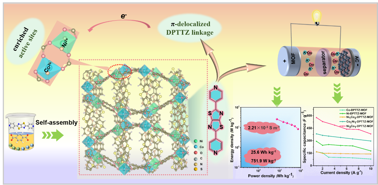 华体会(中国)海峡柔性电子(未来科技)学院石乃恩教授,联合韩敏教授、邱盟峯副教授设计合成了一系列基于线性π共轭噻唑配体2,5-双(4-吡啶基)噻唑并[5,4-d]噻唑的3D双金属导电MOFs,它们由线性π共轭噻唑连接体与双金属镍钴节点构成,通过常压条件下简单的双重缩合反应及常规溶剂热合成工艺即可便捷制备。Ni₃Co₁-DPTTZ-MOF实现了高效的键间电子传输,并构建了独特的通道环境增强电解质的渗透能力,且通过调控本征电子结构促进了电子快速传输。在室温下导电率达到2.21×10–3 S m–1,显著超越单金属MOFs材料,并优于许多已报道的三维导电MOFs。综合DFT分析证实,导带中的p型轨道成分几乎全部来自MOFs中的π共轭配体,且镍掺杂促进了自由电子激发并提高载流子密度,有效提升了MOFs的电导率,从而实现优异的比电容性能。这些发现将为3D c-MOFs材料的设计开辟一条新的途径,并推动其在未来电子器件与储能设备中的进一步发展。相关研究成果以“Enhanced Conductivity and Energy Storing Performances of 3D Bimetallic Conductive Metal-Organic Frameworks Based on Linear π-Conjugated Thiazole for Supercapacitors” 为题, 在线发表于中科院一区TOP期刊国际学术刊物——《Chemical Engineering Journal》上。
