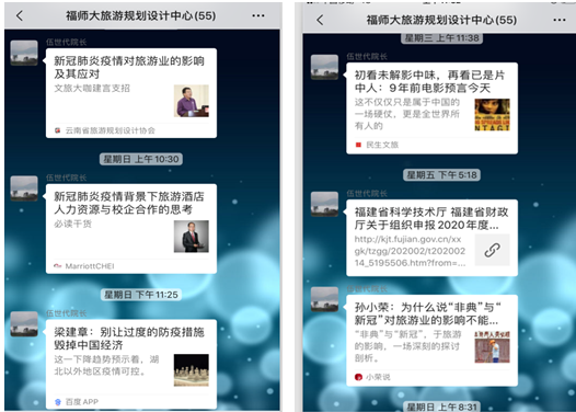 另外,院长伍世代每天都将政府部门、文旅企业、研究机构开展的相关研究和资讯在学院教师微信群分享,号召大家积极对接企业的迫切需求,结合现实问题回应疫情对旅游业产生的影响,迅速围绕国内外旅游业应对疫情的经验、做法和启示,做好旅游业与社会、风险认知、疫区旅行等相关课题、论文和政策建议的撰写,更加精准地帮助文旅企业渡难关、谋发展,为政府和业界提供既有实践意义、又有理论高度的专题研究报告,全面提升行业危机应对能力,减少突发事件对行业的不利影响。