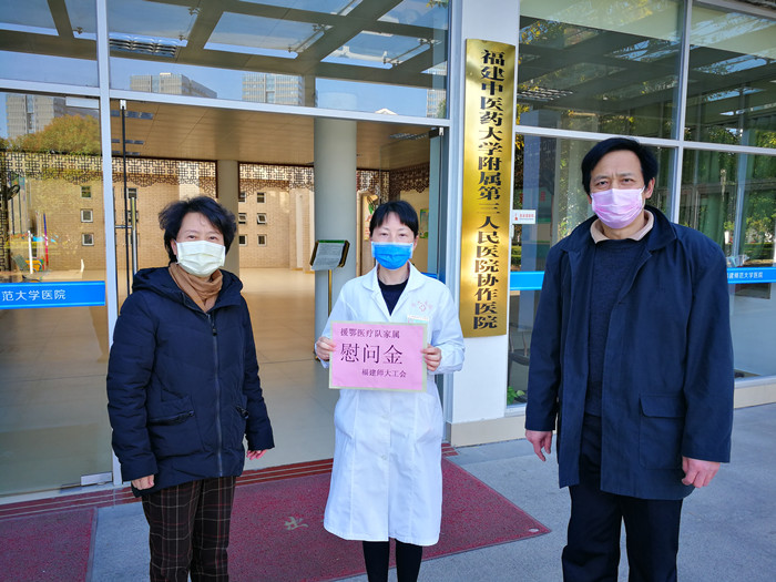 华体会(中国)共有3名教工家属参加福建援鄂医疗队,分别在武汉和宜昌的定点医院参加抗击疫情的医疗救治工作。校工会负责人向家属详细了解了医护人员在湖北抗疫一线的工作、生活情况和家庭生活中存在的困难,代表学校向家属送上慰问金,并嘱咐家属要保重好身体,做好自己和家人的防护工作,确保家人“零感染”,让援鄂医护人员能够安心、放心、顺心地投入疫情防控阻击战。