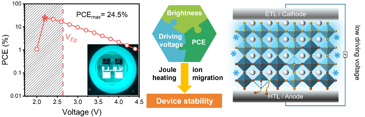 作为一种新型光源技术,蓝光钙钛矿发光二极管(PeLEDs)在外量子效率方面已取得显著进展,但其较差的运行稳定性仍是制约商业化应用的瓶颈问题。目前对蓝光PeLED的稳定性评估多基于较低的初始亮度(100 cd·m-2),所测得的寿命(T50)普遍仅为10-100分钟,而工业显示领域通常要求在1000 cd·m-2的高亮度下进行测试。因此,高亮度下效率较低与器件寿命较短,已成为蓝光PeLED走向商业化所面临的核心挑战。如何在超低电压条件下同时实现高功率转换效率(PCE)与高亮度,是解决PeLEDs运行寿命较短问题的有效途径。