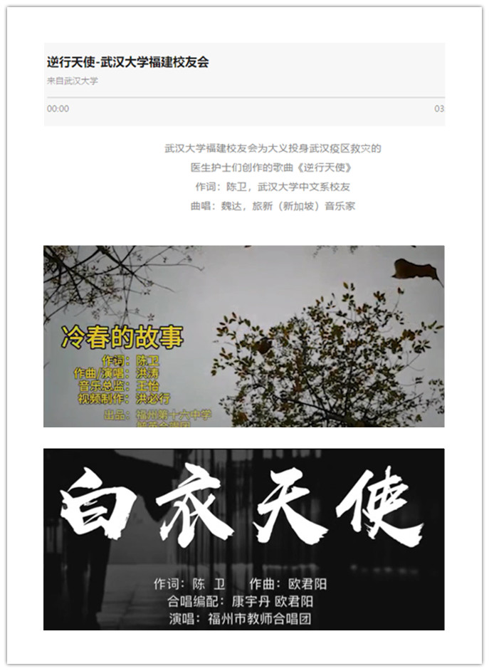 陈卫教授毕业于武汉大学中文系,对武汉有着深厚的感情。新冠肺炎疫情爆发以来,她十分关注武汉疫情。为表达对医护人员敬意与赞美, 125日、24日,她接连创作歌词,并由旅新音乐家魏达、福州教师合唱团艺术指导欧君阳,以及福州十六中学生洪涛分别作曲,形成三首原创歌曲《逆行天使》《白衣天使》《冷春的故事》。歌曲发布后,武汉大学福建校友会、福州市教师合唱团、福州市第十六中毓英合唱团相继使用,社会反响强烈。武汉大学微信公众号还作了专门报道。
