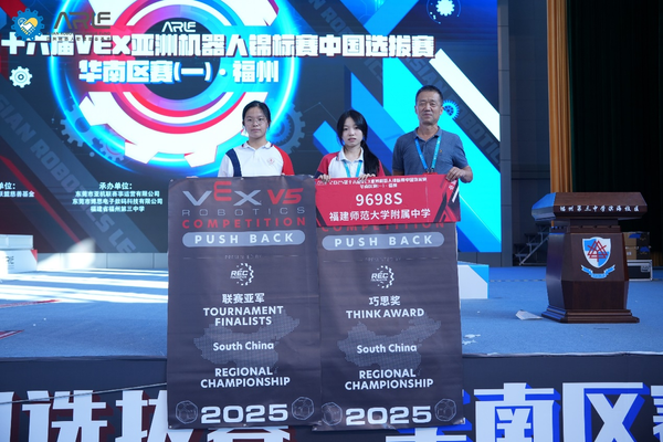 近日,第42届全国中学生物理竞赛福建赛区复赛结束。本次赛事吸引了全省126所学校的1200多名学子参与。附属中学共有19名同学获得一等奖,其中12名同学入选福建省代表队,并将代表福建征战10月底的全国决赛。近日,由亚洲机器人联盟慈善基金主办的“2025第十六届VEX亚洲机器人锦标赛中国选拔赛华南区赛”在福州第三中学滨海校区举办。来自粤桂闽琼地区的近400支优秀赛队参赛。附属中学队号为9698S的参赛队伍(学生:郑雨薇、叶玥童,指导教师:夏洪江)赢得联队赛亚军,同时获评巧思奖。(附属中学)