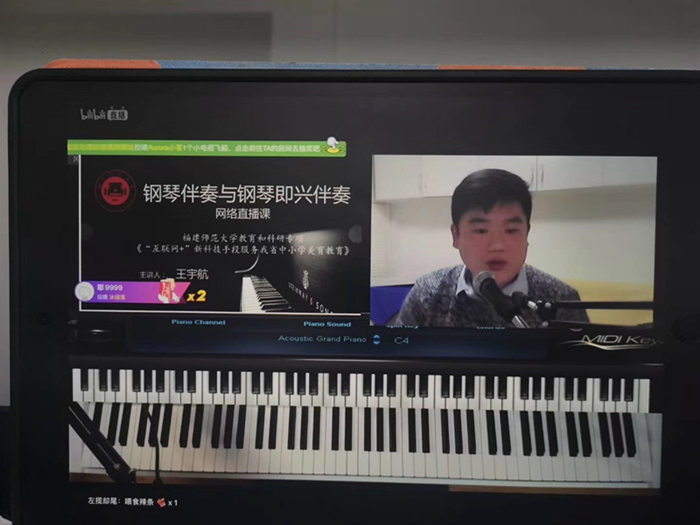 3619:00,王宇航老师的网络直播课《钢琴伴奏与钢琴即兴伴奏》在“哔哩哔哩”网站和“抖音”短视频同时开播。近3小时的直播中,他通过对《每当我走过老师窗前》《明天会更好》《歌唱祖国》《不忘初心》等歌曲的讲授与同学们互动,用音乐向抗疫一线的英雄们致敬。