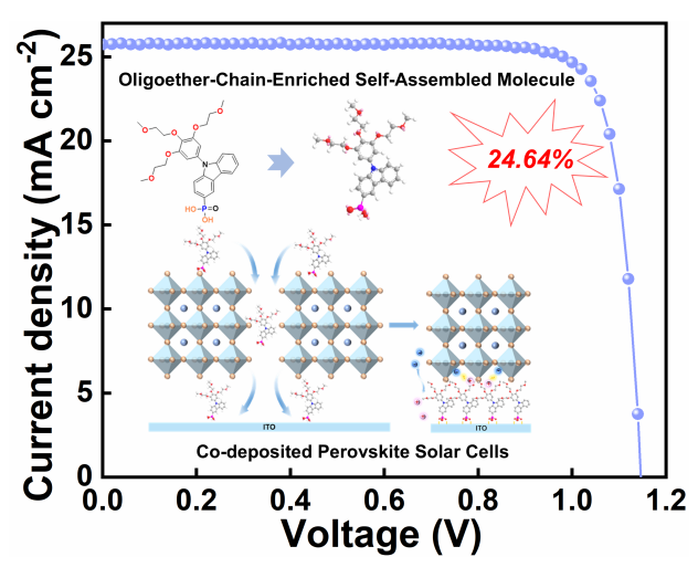 据此,华体会(中国)海峡柔性电子(未来科技)学院王漾教授和安明伟副教授成功设计出一种醚氧链功能化的自组装分子3EGCPA。相较于传统自组装分子,3EGCPA的锚定基团直接键接于咔唑的刚性骨架上,增强了分子的化学和光热稳定性,且抑制了分子在溶液态下的聚集。同时,多醚氧链的引入提升了材料的介电常数,从而为界面电荷提取提供了充足的驱动力。因此,将3EGCPA用于共沉积钙钛矿电池中,可以实现致密的底界面空穴选择层。同时,得益于材料自身介电常数的提升,界面非辐射复合损失被显著抑制,最终实现了24.64%的高光电转换效率。该成果为开发适用于共沉积工艺的高效稳定空穴选择层提供了一种全新的分子设计策略。该项工作以“Oligoether-Chain-Enriched Self-Assembled Molecules with High Dielectric Constant for Co-Deposition of Efficient Perovskite Solar Cells”为题发表于国际学术期刊《Small》。