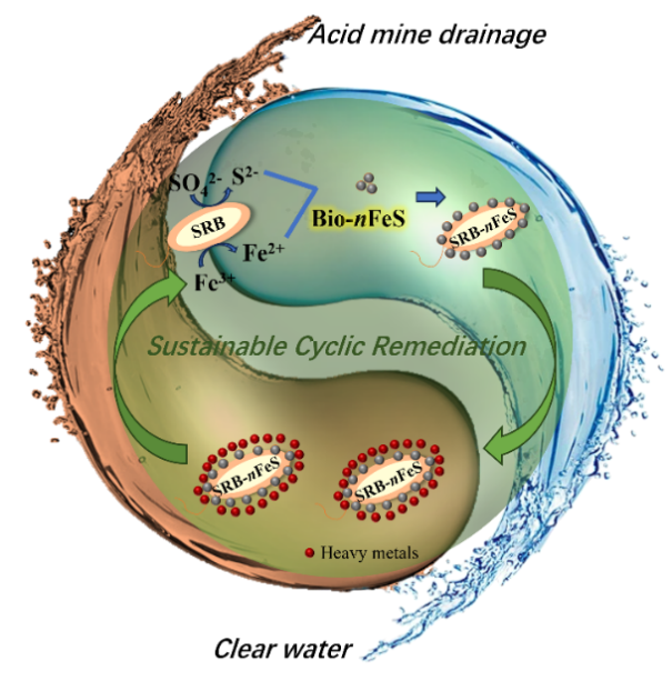 团队成功构建了具有原位自再生能力的SRB-nFeS循环修复系统(Chemical Engineering Journal, 2025, 166474)。该系统利用存活的SRB细胞,以AMD自身成分作为原料,在完成重金属吸附后可持续驱动Bio-nFeS的原位再合成,使材料活性在连续3次吸附-再生-吸附循环后仍能恢复至近100%,展现出极强的工程应用潜力与可持续性。