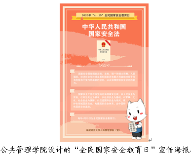 今年“全民国家安全教育日”的主题“坚持总体国家安全观,统筹传统安全和非传统安全,为决胜全面建成小康社会提供坚强保障”。公共管理学院在普法宣讲中介绍了设立全民国家安全教育日的历史背景;讲解了总体国家安全观,引导师生学习国家安全体系内容,并结合疫情现状认识把生物安全纳入国家安全体系的重要性;介绍了青年危害国家安全活动的典型案例,强调要提高反间防特意识,在交友和网络活动中都要警惕和抵制危害国家安全的行为;介绍了公民维护国家安全的权利和义务,重点强调维护国家安全的“八不”行为等。