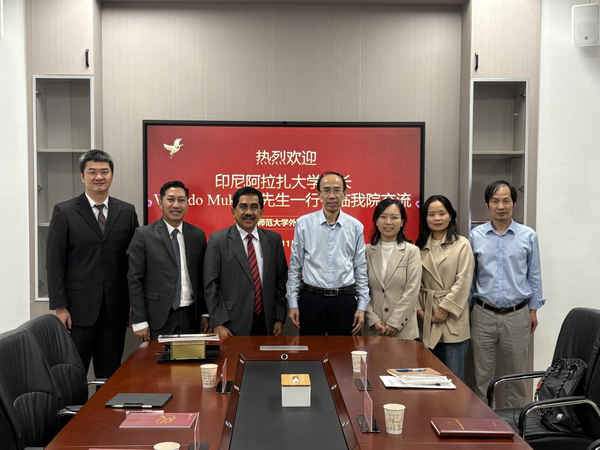 11月18日下午,印尼阿拉扎大学校长Widodo Muktiyo到外国语学院交流,阿拉扎大学孔院印尼方院长、中文系主任 Feri Ansori,孔院中方院长王大昕陪同。外国语学院院长葛桂录、翻译系副主任黄丹青及相关科室负责人参加交流会。