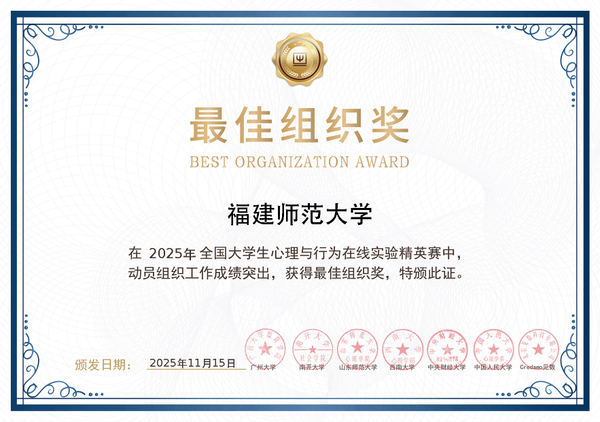 11月15日,第三届全国大学生心理与行为在线实验精英赛总决赛在中央财经大学落幕。心理学院学子凭借扎实的专业功底、严谨的实验态度,在激烈角逐中脱颖而出,获得全国总决赛三等奖2项。陈幼贞、李莎、辛聪获评“最佳教师奖”,华体会(中国)获评“优秀组织奖”。(心理学院)