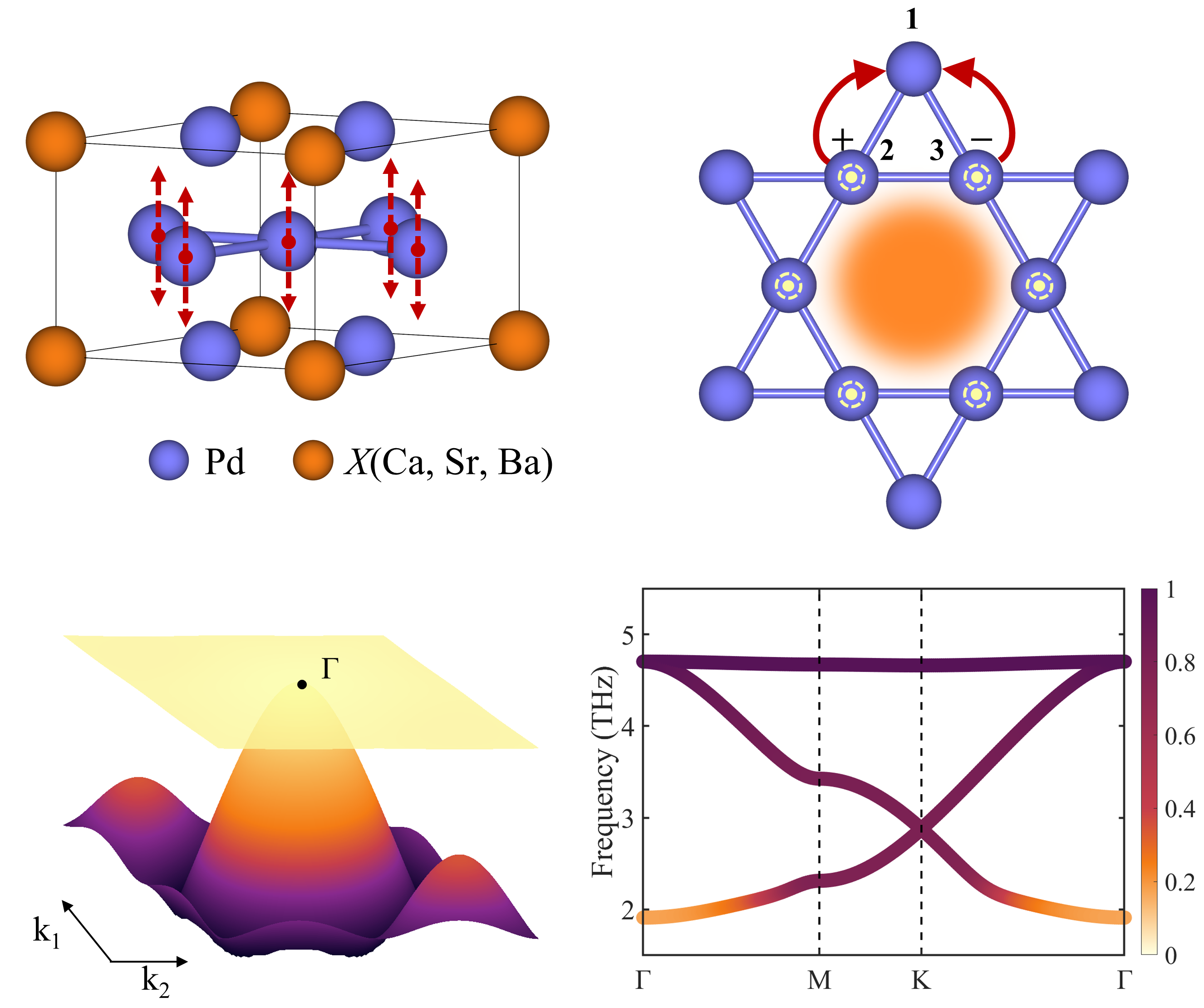 华体会(中国)物理与能源学院张健敏教授、黄志高教授团队长期深入拓扑量子材料领域研究,近期他们在国际上首次报道了新型Kagome超导材料XPd5 (X = Ca, Sr, Ba)中的拓扑电子与声子平带。研究表明,该体系存在位于费米能级上且具有Z2=1非平庸拓扑数的拓扑平带,以及多色散特征共存的范霍夫奇点(vHS),包括m-type与p-type,传统与高阶vHS。同时,通过研究体系玻色子行为特征,揭示了声子频谱中表现的特殊Kagome特征频谱起源于相邻格点的振动模式干涉相消,构建的spring-mass声子模型阐明了其中的物理机制。此外,电子-声子耦合计算表明,CaPd5、SrPd5和BaPd5的超导基态临界温度(Tc)分别为4.25 K、2.75 K和3.35 K。