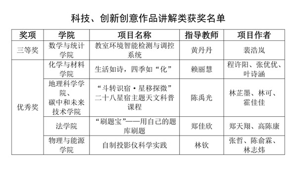 本次活动共有12所高校101件作品进入线下集中展示评选,经专家现场评审,共产生一等奖10件(科学表演类3件,科技、创新创意作品讲解类7件),二等奖20件(科学表演类5件,科技、创新创意作品讲解类15件),三等奖30件(科学表演类8件,科技、创新创意作品讲解类22件)。