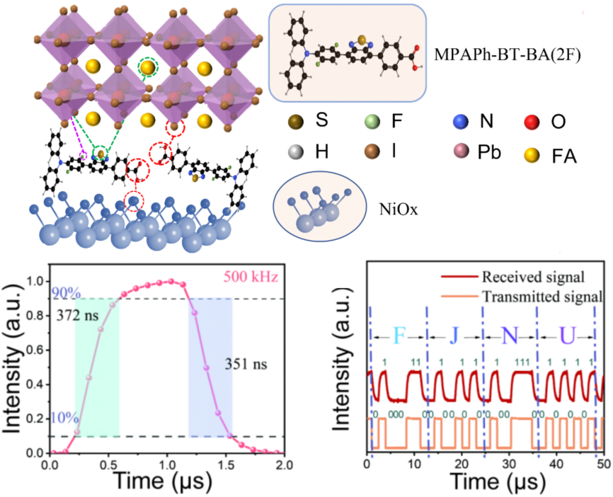 针对这一挑战,华体会(中国)海峡柔性电子(未来科技)学院王越副教授采用D-A型分子MPA2FPh-BT-BA(简称2F)对NiOx/钙钛矿埋底界面进行修饰。该分子利用其给体-受体结构中的高效锚定基团与NiOx表面紧密结合,有效减少了镍空位缺陷;同时,分子骨架通过氢键和配位作用与钙钛矿前驱体相互作用,在埋底界面处诱导形成高质量钙钛矿薄膜,实现了结晶取向调控与界面缺陷同步钝化。基于此策略,团队成功制备了高性能p-i-n结构钙钛矿光电二极管,在自供电模式(0 V)下表现出优异性能:350-830 nm光谱范围内,响应度超过0.2 A/W、比探测率大于1012 Jones;在7.5 mm2的有效面积下,响应速度达到372 ns(上升时间)和351 ns(下降时间)。此外,团队还制备了不同有效面积(1.875 - 43.2 mm2)的器件,验证了该策略的普适性。这些高性能器件成功应用于光通信系统,成功传输ASCII编码字符“FJNU”,充分证明了其在高速光通信领域的应用潜力。该成果以High-performance perovskite photodiode with homogeneous crystallization and buried interface passivation for ultrafast optical communication为题发表于国际学术期刊《Materials Today Chemistry》。