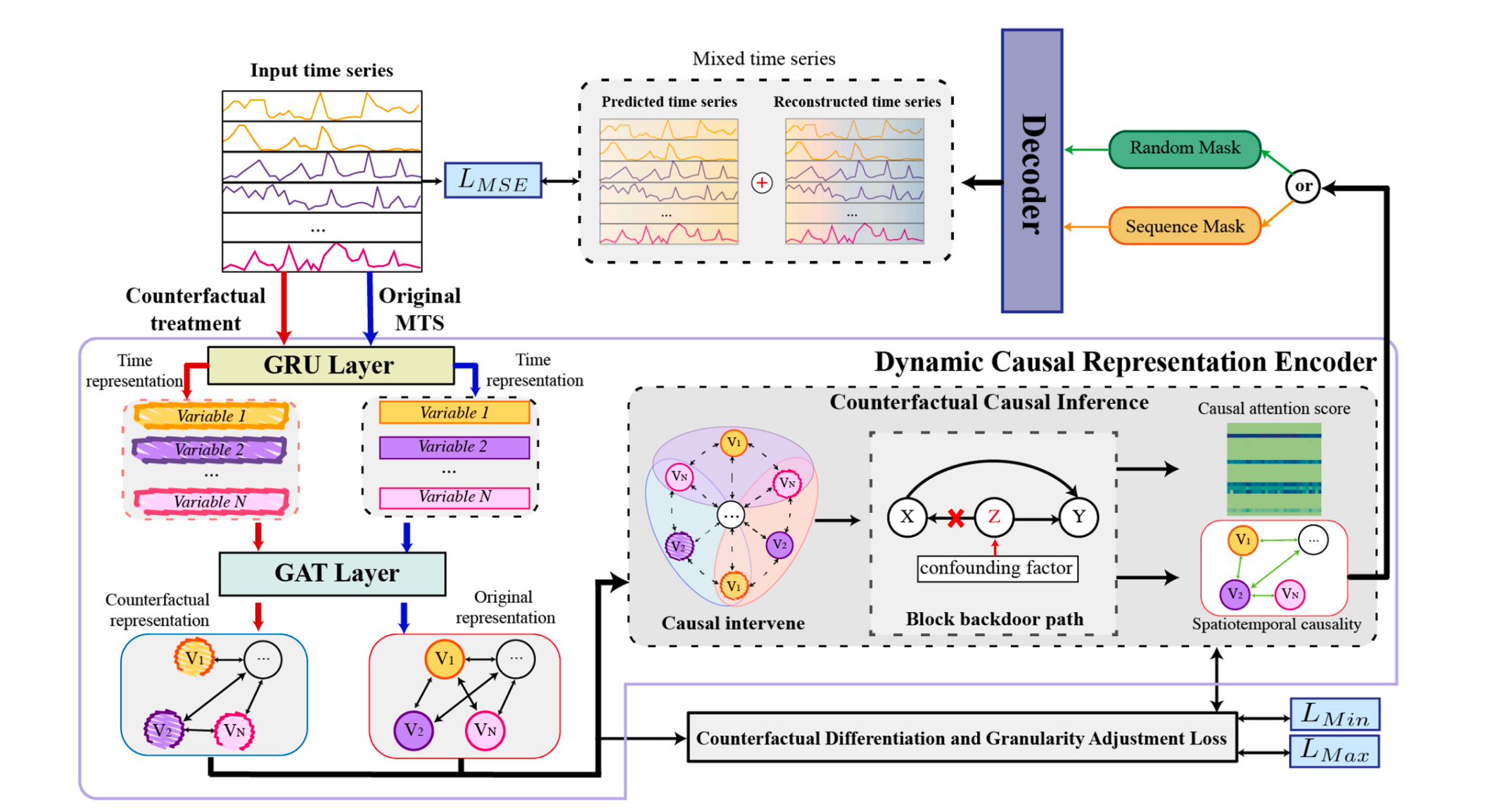 研究成果二:针对已有无监督多元时间序列异常检测方法难以有效地模拟复杂的时空依赖关系,存在着动态混杂因素干扰异常检测的挑战,提出了基于因果推断的细粒度依赖建模方法 SCID。该方法通过构建动态因果表示编码器,利用反事实干预剥离冗余影响因素,准确识别变量间的即时与延迟因果依赖;并引入预测-重构双掩码机制,将时序演化特征与局部结构特征联合建模,从而实现对复杂时空依赖的精细表征。同时,方法在优化目标中加入因果区分与粒度校正项,以缓解多变量粒度不一致带来的偏差,提高对复杂模式演化下异常信号的敏感度。实验结果显示,SCID 在五个真实数据集上取得领先表现,能够有效识别由隐含因果链条驱动的细粒度异常。该成果以“Fine-grained multivariate time series anomaly detection via causal inference”为题,华体会·官方版网站登录入口为第一完成单位,第一作者为华体会(中国)2023级研究生陈祥炜同学(现为大连理工大学博士研究生),发表在国际知名期刊《Knowledge-Based Systems》上,该期刊属于中科院一区TOP期刊。
