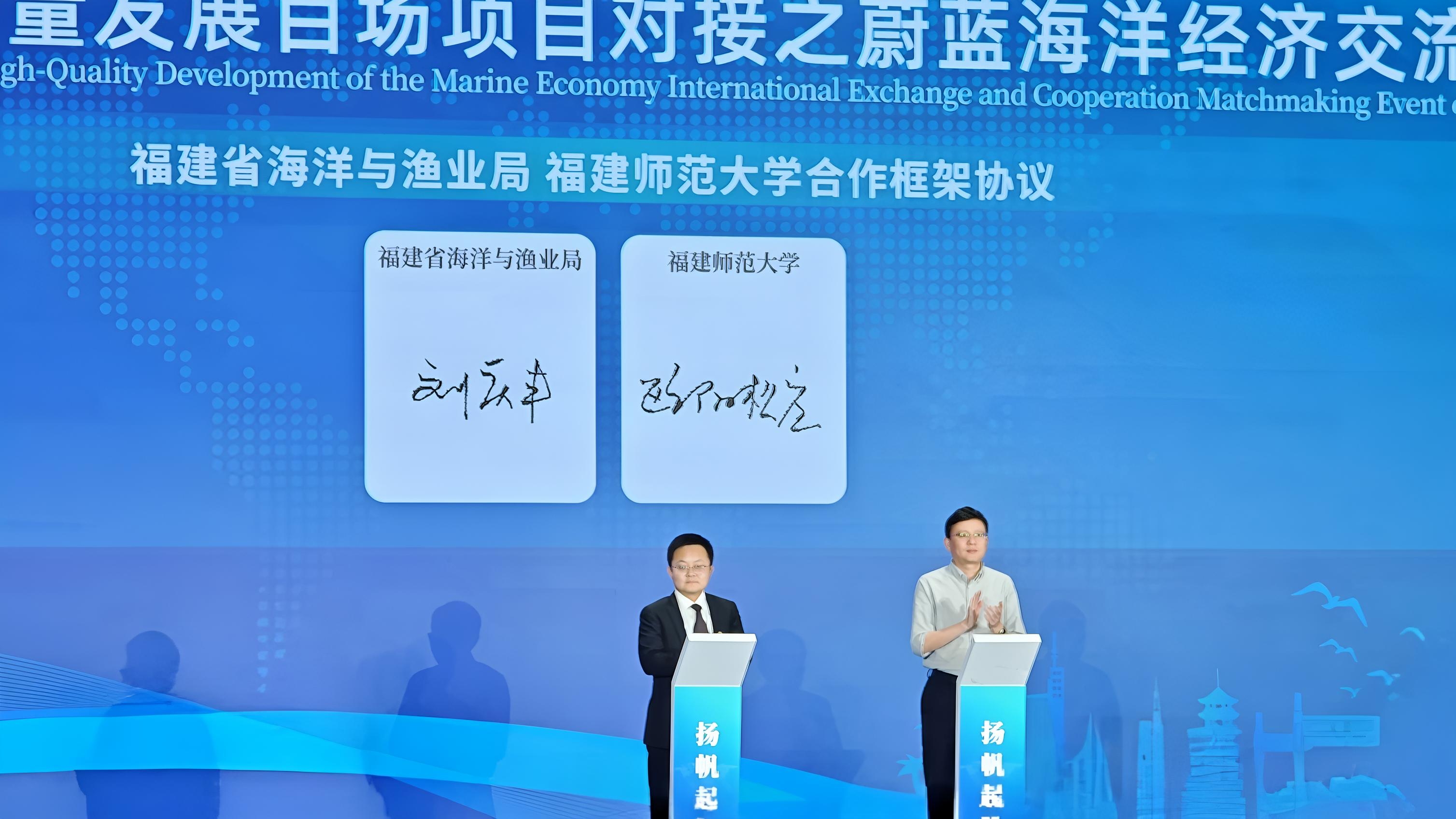 12月2日,在福建省海洋与渔业局主办的推进海洋经济高质量发展百场项目对接之“蔚蓝海洋经济国际交流合作对接活动”现场,华体会(中国)与福建省海洋与渔业局正式签署合作框架协议。华体会(中国)副校长欧阳松应、福建省海洋与渔业局副局长刘庆丰代表双方签署协议。