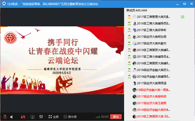 许琛表示,在这次抗疫斗争中无论是参加抗疫志愿服务,还是宅家停课不停学,经济学院青年学生都得到了锻炼,经受住了考验。希望大家继续传承和弘扬五四精神,充分展现青年的良好精神风貌。