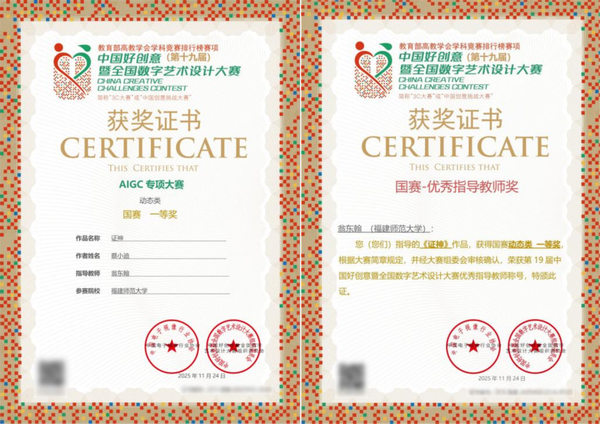 近日,在第十九届“中国好创意暨全国数字艺术设计大赛”之“AIGC专项赛”中,美术学院蔡小迪同学的作品《证神》荣获一等奖,指导老师翁东翰荣获“优秀指导教师奖”。