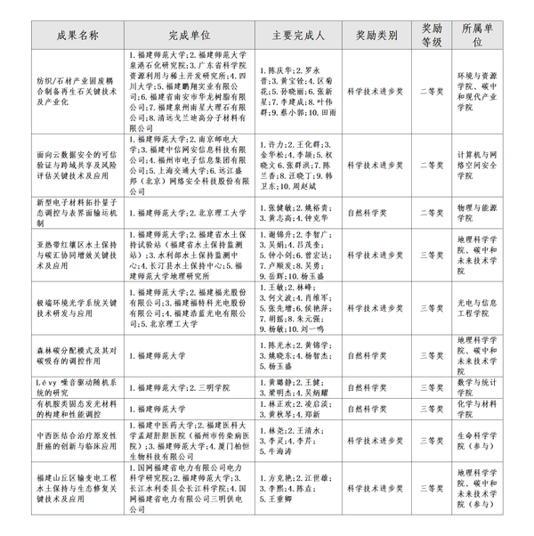 其中,环境与资源学院、碳中和现代产业学院陈庆华教授,计算机与网络空间安全学院许力教授获得科学技术进步奖二等奖;物理与能源学院张健敏教授获得自然科学奖二等奖;地理科学学院、碳中和未来技术学院谢锦升教授,光电与信息工程学院王敏教授获得科学技术进步奖三等奖;地理科学学院、碳中和未来技术学院陈光水教授,数学与统计学院黄璐静副教授,化学与材料学院林正欢教授获得自然科学奖三等奖;生命科学学院李芹副教授、科学技术处牛海涛老师(参与),地理科学学院、碳中和未来技术学院方克艳教授(参与)获得科学技术进步奖三等奖。