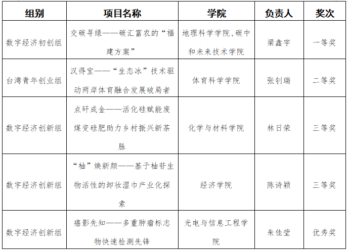 据悉,本届大赛以“青春为中国式现代化挺膺担当”为主题,吸引了1266个项目报名参赛。大赛下设科技创新、数字经济、台湾青年创业三个专项,共决出一等奖7个、二等奖21个、三等奖34个、优秀奖49个,并评出“优秀组织奖”8个。
