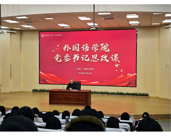 12月14日,外国语学院党委书记林鲁文在陈明金楼多功能厅为2025级全体本科生讲授题为“努力成为具有家国情怀、国际视野与人文素养的新时代外语人”的思政课。