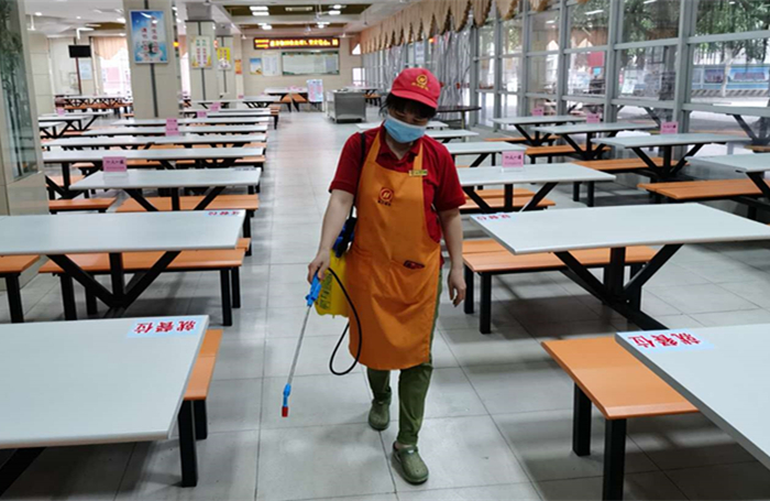 工作人员在餐厅进行保洁和消杀。