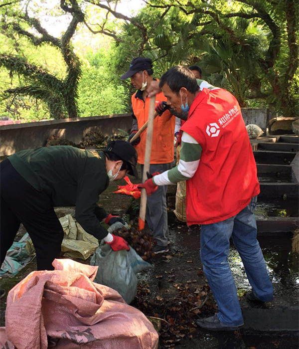 工作人员在清理校园枯枝落叶。