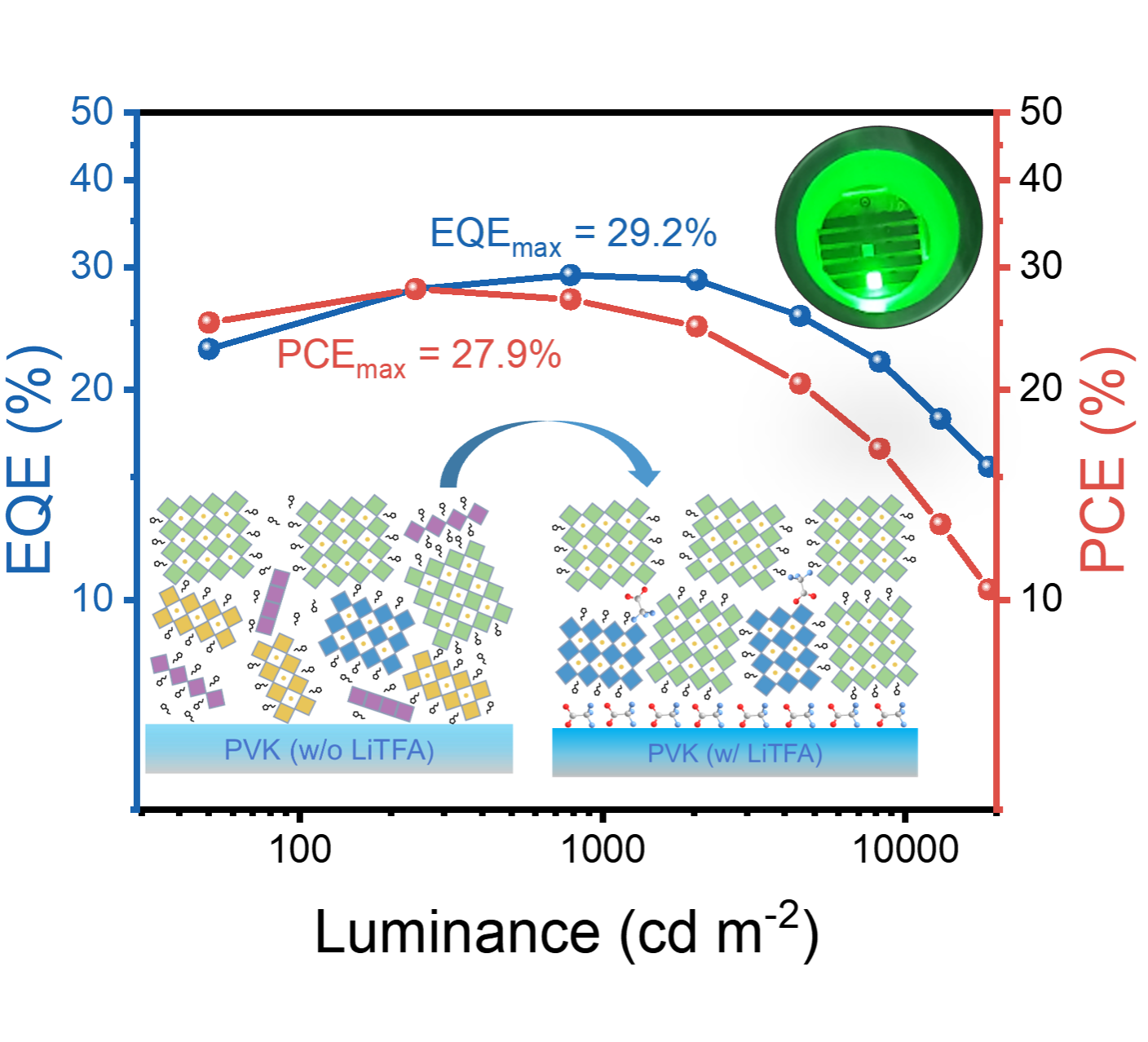 针对上述问题,华体会(中国)陈大钦教授研究团队创新性地将氟化小分子盐三氟乙酸锂(LiTFA)引入空穴传输层,利用其多重官能团的协同作用,调控钙钛矿的结晶过程。LiTFA不仅能作为成核中心促进三维钙钛矿相的生长,还通过氢键作用有效抑制低维相的形成,从而构建出更稳定的埋底界面结构。基于此策略优化后的PeLEDs实现了29.2%的外量子效率和27.9%的功率转换效率。更值得注意的是,在1000 cd m-2的初始亮度下,器件的T90寿命提升至726分钟。这一埋底界面工程策略被证明是同时提升PeLEDs效率和稳定性的关键所在,不仅适用于绿光器件,也在天蓝光PeLEDs中展现出良好的普适性,为开发高性能、长寿命的钙钛矿光电器件提供了重要借鉴。
