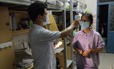 物理与能源学院有科研任务研究生和顶岗实习毕业班学生返校。学院领导钟伟兰、黎胜禄,辅导员伏旭斌、吴晓静坚守学生宿舍楼,为返校学生测量体温,询问返校行程及近期健康状况,再次强调返校安全注意事项,并为同学们发放爱心袋。