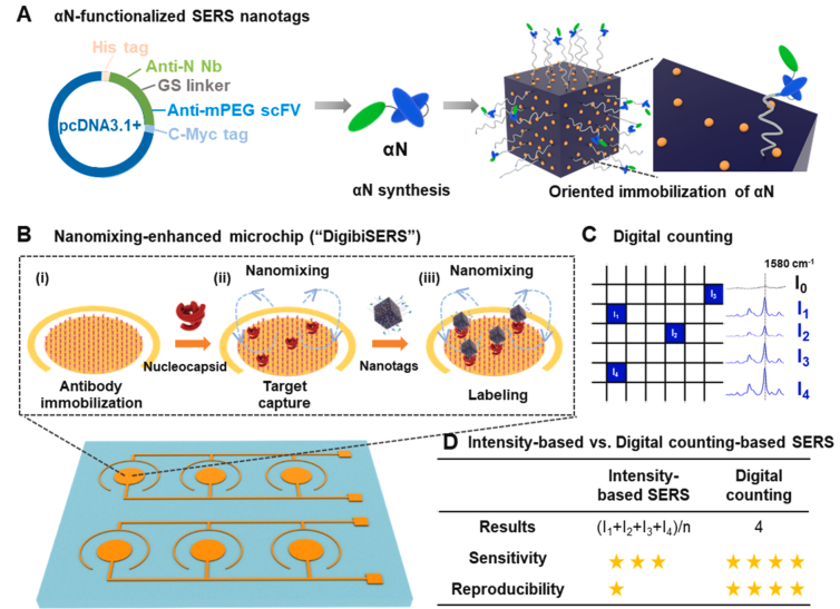 表面增强拉曼散射(SERS)技术因具备超高灵敏度和多重检测潜力,被广泛认为是新一代生物检测的重要发展方向。然而,在实际应用中,SERS检测仍面临两个核心瓶颈:一是抗体在纳米探针表面的取向随机,导致信号不稳定;二是传统强度型读出方式难以实现可靠定量,限制了其在临床检测中的推广应用。