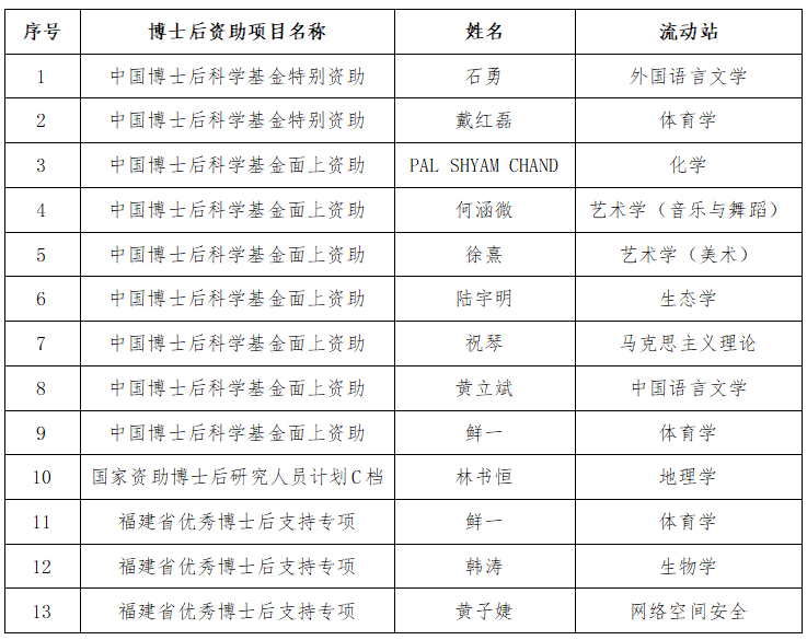 近日,中国博士后科学基金会公布了第78批中国博士后科学基金面上资助人员名单,华体会(中国)获资助4项。2025年,华体会(中国)累计获中国博士后科学基金特别资助2项、面上资助7项,国家资助博士后研究人员计划(C档)1项,福建省优秀博士后支持专项3项;入选国家级博士后引进专项建议人选2人。此外,在站博士后共获国家自然科学基金青年科学基金3项、国家自然科学基金外国学者研究基金项目1项,国家社会科学基金一般项目2项。 (人事处、高层次人才工作办公室)