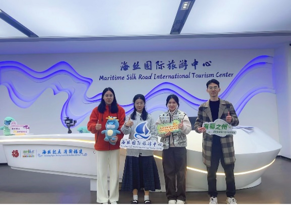 近日,有福之州(泰国)直播中心揭牌仪式在福州举办,福州市文化和旅游局成为携程旅游首个海外挂牌直播合作伙伴。应活动主办方邀请,外国语学院四名海丝蓝飘带志愿者许莉鸣、金雨轩、欧凯茜、陈开华同学作为福州文旅推介官,参与活动外语推介口播视频录制工作。