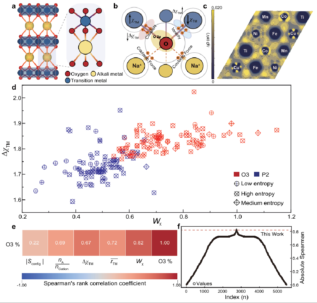 钠离子电池层状氧化物正极(NaₓTMO₂)的性能高度依赖于其堆叠结构(O3型或P2型)。通常钠含量是决定结构类型的关键因素。然而,在高熵或多组分体系中,由于过渡金属(TM)种类增多、相互作用复杂,组成与结构之间的关联变得模糊,“阳离子势”等规则失效,使得高性能、高稳定性正极材料的合理设计面临挑战。