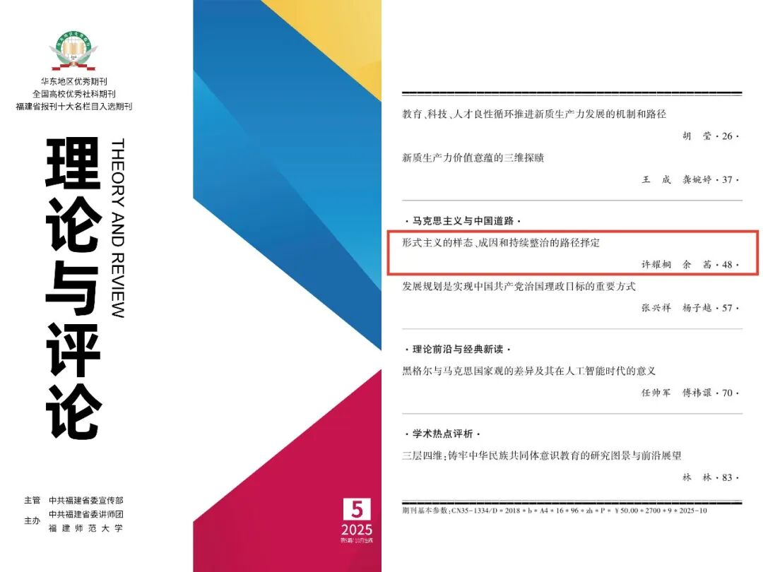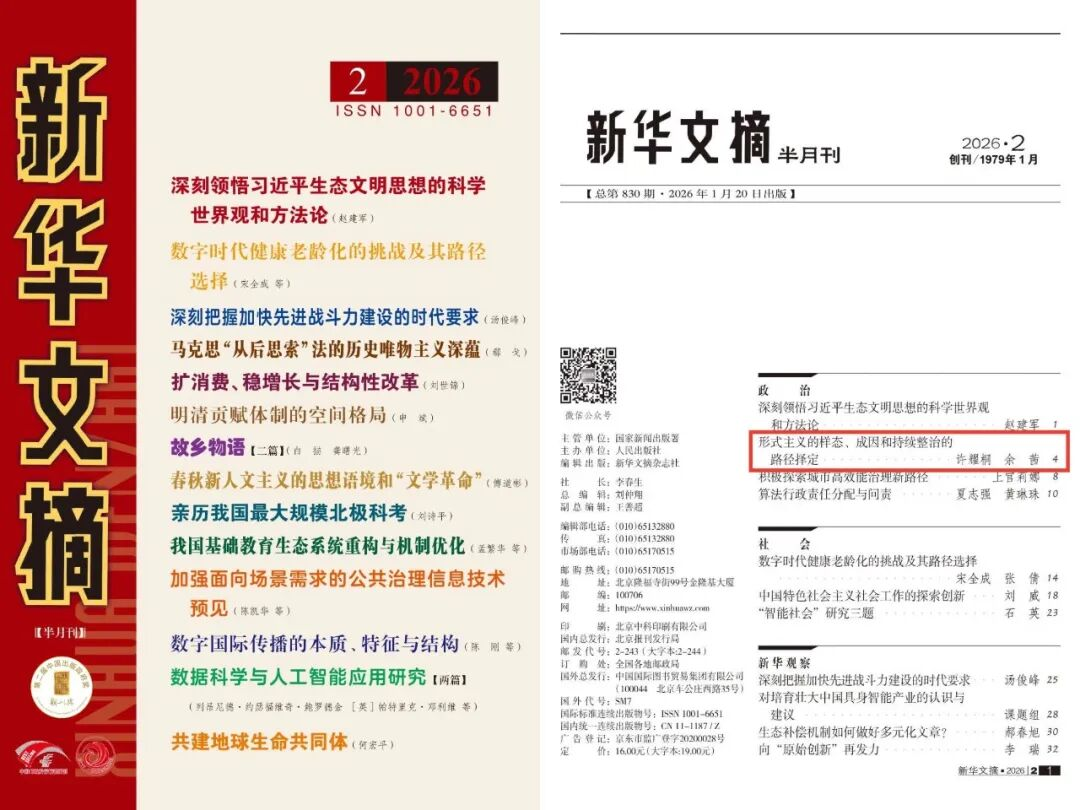 近日,《理论与评论》2025年第5期刊发的《形式主义的样态、成因和持续整治的路径择定》一文被《新华文摘》(2026年第2期)全文转载。此前,该文还被人大复印报刊资料(《中国共产党》2026年第1期)全文转载。该文作者系华体会(中国)马克思主义学院特聘教授、中共中央党校(国家行政学院)一级教授许耀桐,中共北京市委党校(北京行政学院)副研究员余茜。(马克思主义学院)