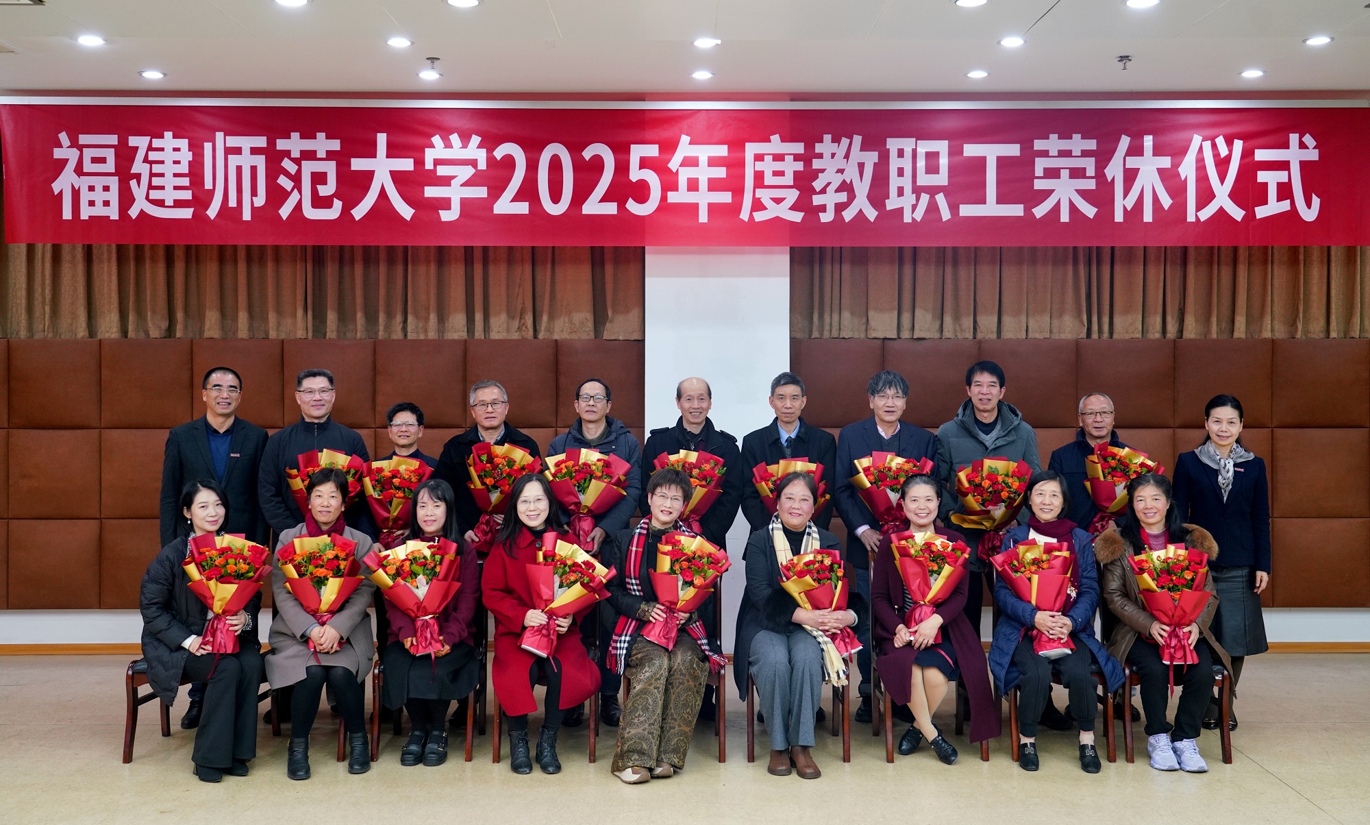 仪式现场播放“岁月如歌育桃李 初心如磐传薪火”2025年度荣休纪念视频,校领导向荣休教职工敬赠鲜花、水晶杯等荣休纪念品,并与荣休教职工合影留念。