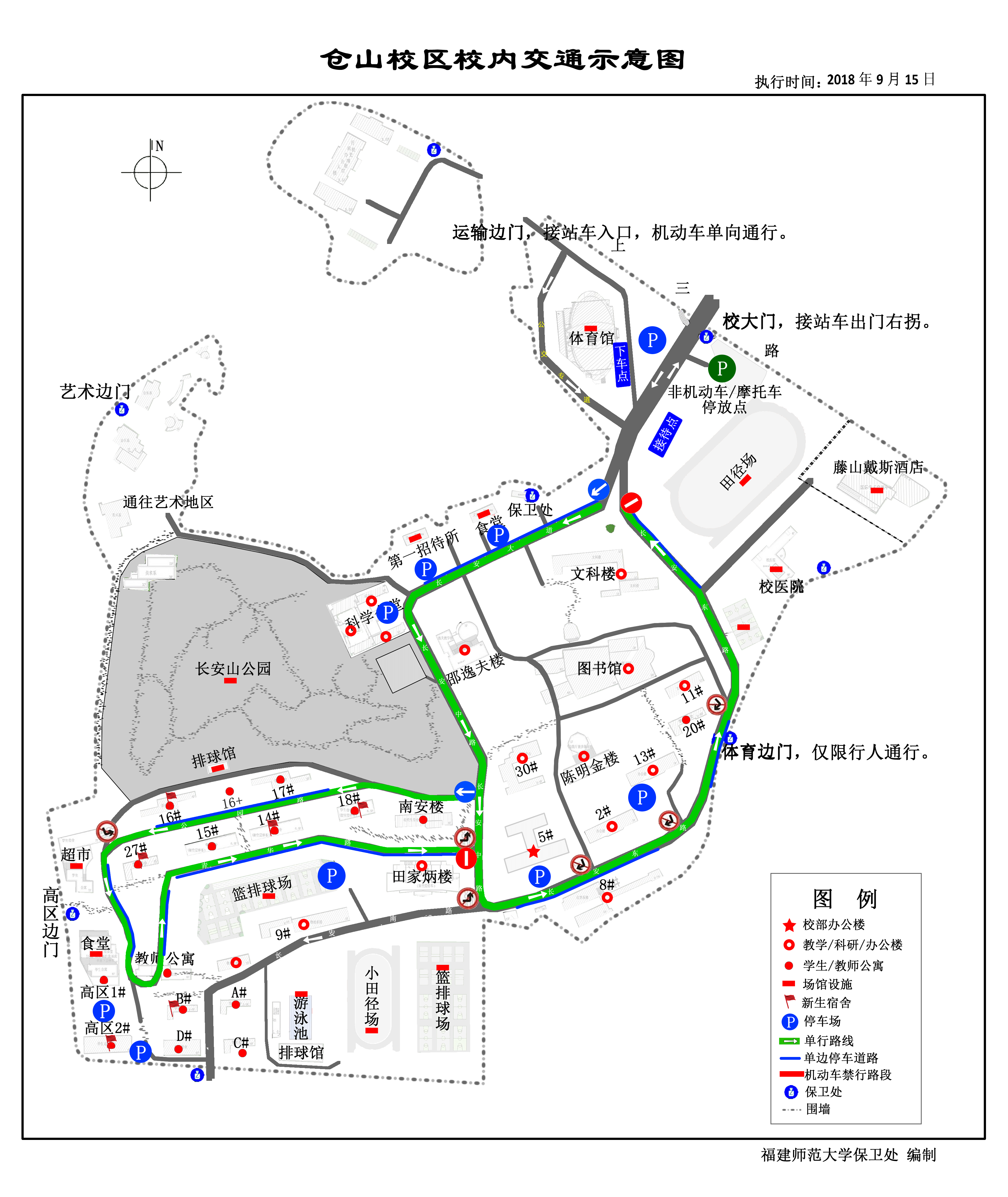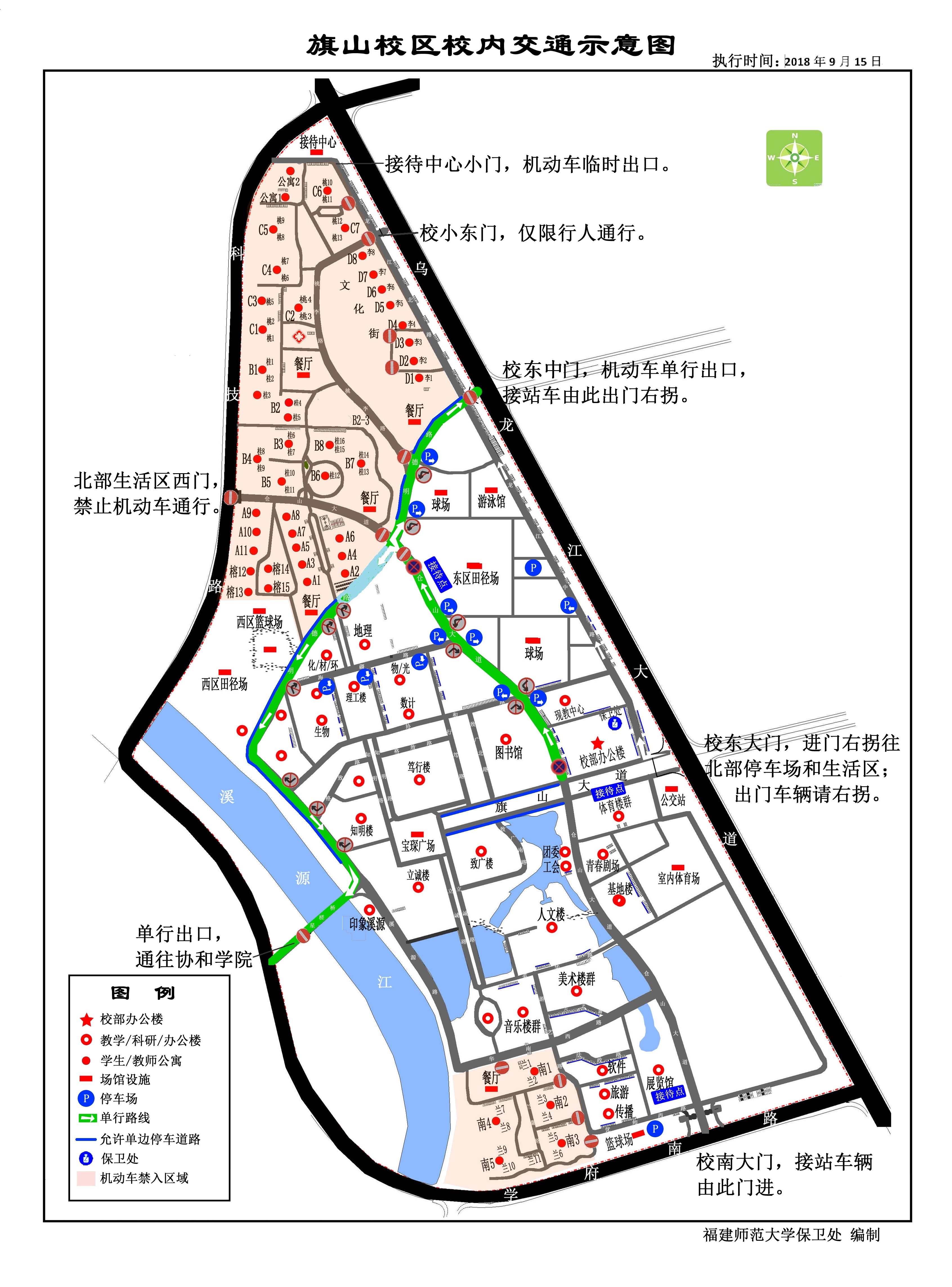 (三)东中门(明德路),星槎桥门,仓山大道北段,明德路,溪源路北段实行单向通行,北部生活区西门禁止机动车通行,出东门、东中门的车辆一律右拐通行。请严格按交通示意图行驶,严禁逆向行驶。