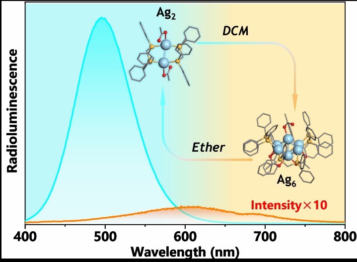Recently, FNU Yao Chuanhao’s research team at the Strait Institute of Flexible Electronics (Future Technology) has made significant progress. They synthesized two types of silver clusters, Ag2 and Ag6, and revealed an intriguing solvent-driven reversible transformation between them. While both Ag2 and Ag6 display excellent photoluminescence properties, Ag2 demonstrates superior performance in X-ray radioluminescence compared to Ag6. Flexible scintillator films fabricated from Ag2 clusters exhibit outstanding X-ray imaging capabilities, achieving a spatial resolution of 15.0 lp/mm and a detection limit for an X-ray dose of 0.58 μGy s-1. This detection limit is nearly 10 times lower than the typical dose rate used in X-ray diagnostics (5.5 μGy s-1). The scintillator films incorporating Ag2 are expected to significantly reduce the radiation dose during X-ray diagnostics (e.g., CT), thus enhancing patient safety. This work not only confirms that solvent serves as an effective inducer for triggering the reversible transformation of silver clusters but also opens up a new avenue for developing silver cluster emitters for applications in X-ray imaging and detection. Relevant work, entitled “Reversible Interconversion between Ag2 and Ag6 Clusters and Their Responsive Optical Properties,” has been published in the top internationally renowned journal Journal of the American Chemical Society.