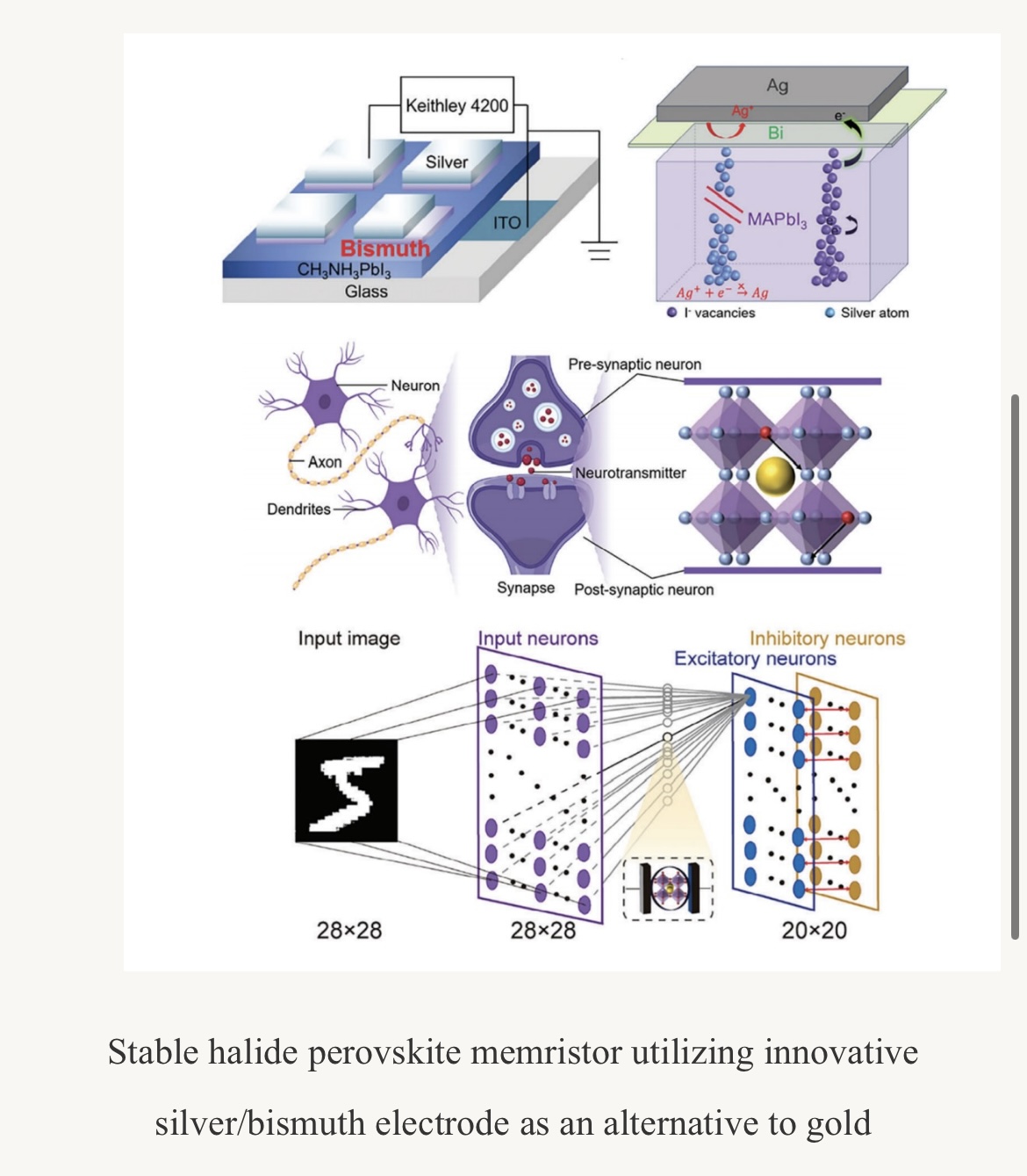 In addition to these advancements, the memristor successfully replicates key synaptic behaviors, including potentiation, depression, long-term memory, short-term memory, and adherence to Hebbian learning rules. Furthermore, the device was applied to a Spiking Neural Network (SNN) for digit recognition tasks, achieving an impressive accuracy of 86.6% on the MNIST dataset. These findings highlight the potential of Ag/Bi bilayer electrodes to significantly enhance the performance and expand the applications of perovskite memristors, paving the way for their integration into neuromorphic computing systems.