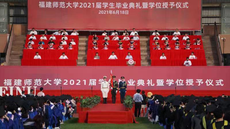 The graduation ceremony was held at the East Athletic Field of Qishan Campus on the morning of June 18th. More than 8,000 people attended the event, including FNU leaders, heads of departments and divisions, party and government leaders of all the colleges, staff representatives, the counselors of the graduating class, all the graduates of 2021, some graduates of the class of 2020 who had returned to the campus and parents of some graduates. The ceremony was presided over by FNU Vice President Chen Qinghua.
