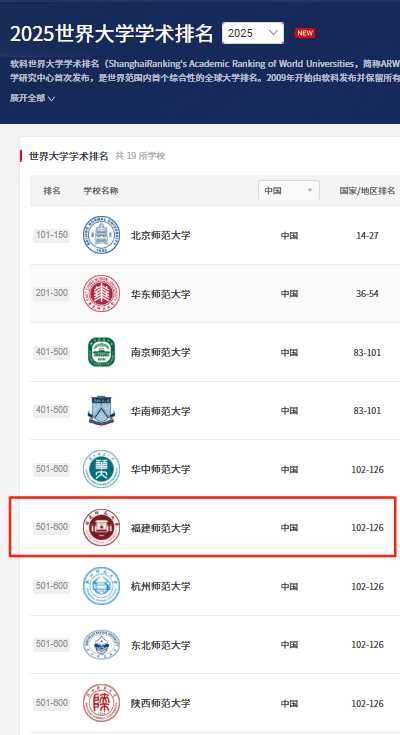 On August 15, the ShanghaiRanking Consultancy released the 2025 Academic Ranking of World Universities (ARWU), in which Fujian Normal University (FNU) demonstrated significant progress. The university now ranks within the 501–600 band globally, rising approximately 100 places compared to the previous year.