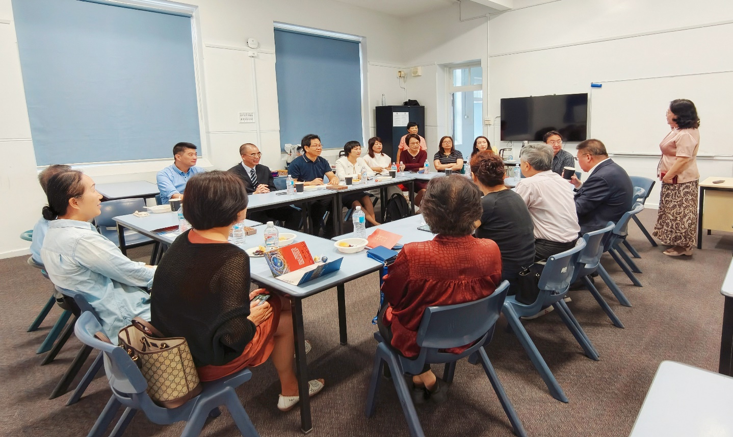 The delegation visited several educational institutions in Australia to explore the integration of Chinese language education into local K–12 systems. At the Chinese Language Teachers’ Association of Victoria, the team observed classroom teaching, reviewed localized curricula, and discussed challenges related to multicultural classrooms and the development of “Chinese Plus” programs. These exchanges provided valuable insights for future curriculum design and teacher support.