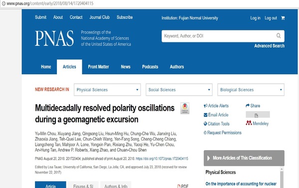 Recently, as co-authors who contributed equally, Professor Jiang Xiuyang from College of Geographical Sciences, FNU, Professor Liu Qingsong and Assistant Professor Zhou Youmin from Southern University of Science and Technology published an online paper entitled“Multidecadally resolved polarity oscillations during a geomagnetic excursion”in the internationally renowned academic journal Proceedings of the National Academy of Sciences of the United States of America(PNAS).